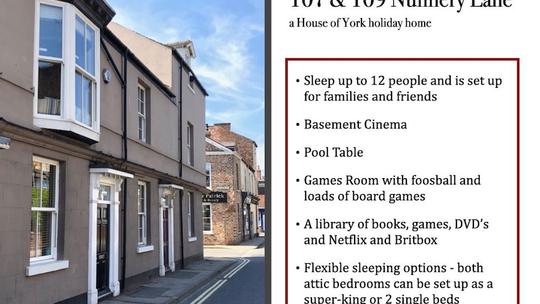 107 & 109 Nunnery Lane - a House of York holiday home combines 2 town houses that can sleep up to 12 people. It is cosy and luxurious with a pool table, cinema and games room and its right by the historic city walls. We're a 10 min walk from the station (parking available) and a 7 min stroll in the centre of York. Situated just off ‘Bishy Road’ (voted Britain’s best high street) there's also fantastic independent shops, pubs, restaurants, cafes, delis and takeaways just a minute walk away. Prices start at £170 per night.
