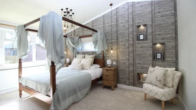 Kingfisher Lodge - Kingfisher lodge is a beautifully furnished lodge with a four-poster bed to the Master bedroom and a luxury roll-top bath to the en-suite. It has a log burner effect fire in the sitting room. Quite simply, it is ideal for romantics! The lodge has ample living and storage space with very generous sized bedrooms and is therefore ideal for longer stays. The lodge has stunning views over the wildlife ponds, and into the woodland beyond. There is a sunken hot tub on the decking, perfectly positioned to make the best of the views.