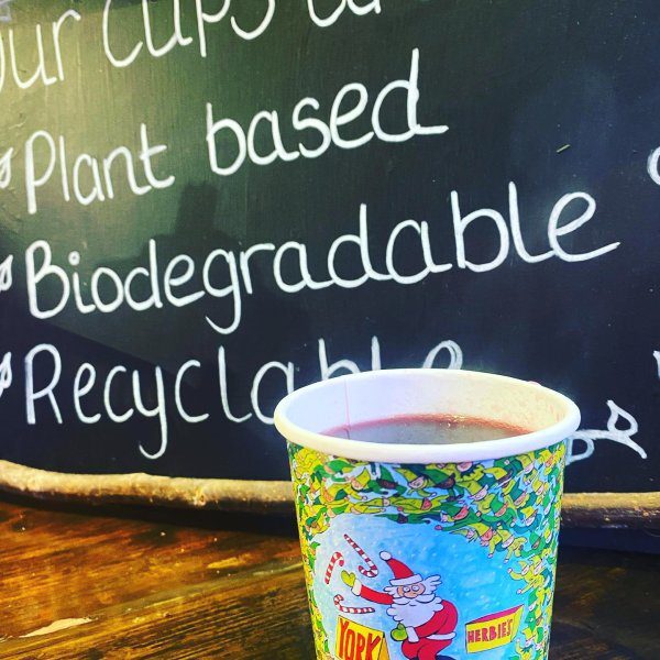 A Christmas bar decked with vintage toys and decorations serving premium products – German Gluhwein, fantastic hot chocolates and a vegan range – in one-of-a-kind York cups.